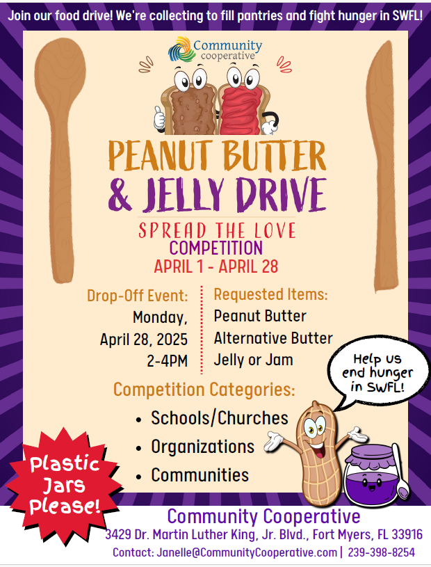 FORT MYERS, Fla. (March 31, 2025) – Community Cooperative is excited to announce the kickoff of its annual Peanut Butter & Jelly Drive, an initiative rooted in the organization’s history of kindness and giving. The tradition began with the simple act of handing out PB&J sandwiches in downtown Fort Myers, and today, the Peanut Butter & Jelly drive continues to honor that generosity by collecting these pantry staples for families in need.