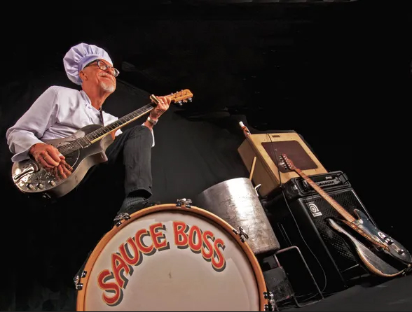 Sauce Boss mixes media like cornbread. Hot sauce, blues, chicken, funk, onions and okra, heartfelt songs, peppers and soul, seafood… and slide guitar, all go into the gumbo. The aroma fills the place. The crowd stirs up the pot. The Sauce Boss stirs up the crowd, and at the end of the show, everyone eats. He has served hundreds of thousands for free at his live shows.