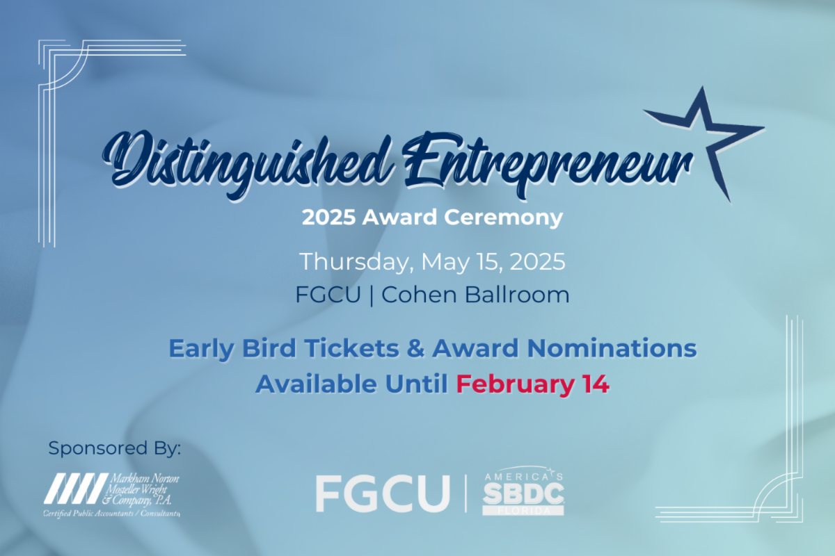 Entrepreneurial Insights is an email newsletter designed to provide snippets of the SBDC at FGCU’s knowledge and insights to the SWFL entrepreneurial and business communities. Filled with articles about current issues in the business world and recommendations on how to thrive in this community, the Entrepre- neurial Insights email newsletter is your one-stop shop for all things small bus- iness and SBDC. News and Updates: DISTINGUISHED ENTREPRENEUR TICKETS NOW ON SALE! Mark your calendars for one of the most anticipated events of the year—the 2025 Distinguished Entrepreneur Awards, hosted by the Florida SBDC at FGCU! This inspiring celebration of Southwest Florida’s small business leaders will take place on May 15 at the beautiful Cohen Ballroom at FGCU. This prestigious event highlights the achievements of local entrepreneurs who have demonstrated innovation, advocacy, and leadership in shaping the SWFL business community. Attended by over 150 community leaders and business owners, the Distinguished Entrepreneur Awards are the perfect opportunity to honor excellence and connect with like-minded professionals. Tickets are on sale now—don’t miss your chance to attend! By joining us, you’ll not only celebrate the achievements of our region’s top entrepreneurs, but you’ll also strengthen your connections within the vibrant SWFL business ecosystem. Visit our website to purchase your tickets today and join us in supporting and cele- brating the small businesses that make our community thrive. Together, let’s recog- nize the leaders shaping the future of SWFL! Distinguished Entrepreneur Awards CEO XCHANGE Take a Seat at the Table and Unlock Success Are you ready to take your leadership to the next level? CEO XChange is an exclusive, confidential executive roundtable tailored for Southwest Florida’s top CEOs and business owners. This dynamic program, sponsored by Bank of America, creates opportunities for peer-to-peer engagement, where non- competing leaders collaborate to solve real business challenges and share actionable insights. Held monthly, CEO XChange provides a trusted environment for professional and personal growth, guided by experienced facilitators. Members gain access to valuable resources, personalized consulting, and a strong network of fellow executives who understand the complexities of leadership. Membership is limited and applications for the 2025 calendar year are closing soon! Join this unique community of business leaders and unlock new oppor- tunities for growth, visioning, and success. Visit our website to apply today! CEO XChange ABC’s of EXPORTING ROADSHOW Discover how to take your Florida-based business to the global stage with the ABC’s of Exporting Roadshow, hosted by the SBDC at FGCU and Florida Commerce. This event is designed to help businesses explore inter- national market opportunities, assess export readiness, and learn practical strategies for success. Attendees will gain insights into identifying and tar- geting foreign markets, choosing effective market entry strategies, and im- plementing techniques to establish a strong international presence. Featur- ed speaker Michael Schiffhauer, VP of International Trade and Develop- ment, will share his expertise on global trade opportunities. Don’t miss this opportunity to learn actionable steps to expand your sales and grow beyond borders. Visit their website for more details and registration information! February 18, 2025 Lee County Economic Development Office Conference Room 9 a.m. – 12 p.m. 2201 Second Street, Suite 600 Fort Myers, FL, 33901 ABC’s of Exporting Roadshow STUDENT SUCCESS and BUSINESS READINESS PROGRAM Connecting Talent with Opportunity The Student and Small Business Readiness Program connects FGCU students with local small businesses through tailored micro-internships that align with career goals and business needs. This program offers students valuable, real- world experience while providing small businesses with cost-effective project support and fresh ideas. Businesses can post opportunities through the Eagle Career Network, and stu- dents apply via FGCU Career Development Services. The SBDC at FGCU and Career Development Services match students with businesses, fostering mean- ingful collaborations that benefit both parties. This initiative helps students build resumes, explore career paths, and establish professional networks while small businesses gain access to skilled talent and strengthen their ties to the community. It’s a win-win for Southwest Florida’s future workforce and business landscape. Student Success and Business Readiness THANK YOU, FIRST CITIZENS BANK! We extend our heartfelt gratitude to First Citizens Bank for their generous grant awarded to the Florida SBDC at FGCU. This support plays a vital role in advancing our mission to help small businesses in Southwest Florida launch, grow, and thrive. The grant will directly benefit local entrepreneurs by providing essential resources and services that empower them to succeed and contribute to a stronger regional economy. We are proud to partner with First Citizens Bank, whose commitment to community enrichment aligns with our shared goal of creating lasting, positive change for small businesses. Thank you for investing in the future of Southwest Florida’s business community. Wings up! Upcoming Workshops: Financial Statements: Capturing their Value, Meaning, and Business Impact Webinar | 02/11 Tuesday 11:00 am – 12:00 pm Register Finding Hidden Cash in Your Business Webinar | 03/11 Tuesday 11:00 am – 12:00 pm Register Contact the SBDC for more information Want to request a topic or give more feedback? Click Here |