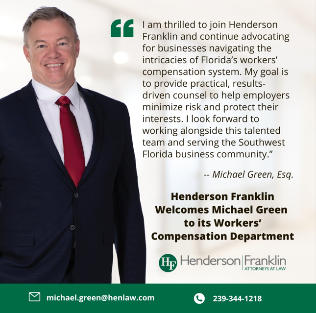 Fort Myers, Florida – Henderson, Franklin, Starnes & Holt, P.A. is pleased to welcome Michael Green as a Senior Associate in the firm’s Workers’ Compensation Department. With more than 15 years of experience in labor and employment law, he focuses his practice on defending employers, insurance carriers and self-insured entities against workers’ compensation claims throughout Florida.