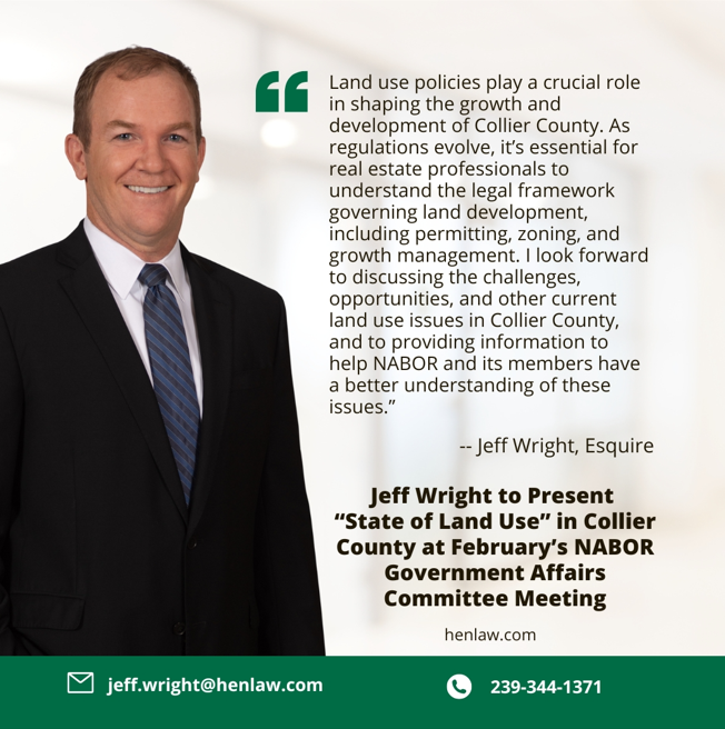 Naples, Florida — The law firm of Henderson, Franklin, Starnes & Holt, P.A. is pleased to announce Jeff Wright, a Florida Bar Board Certified expert in City, County & Local Government Law, will be a speaker at the upcoming NABOR Government Affairs Committee meeting on Monday, February 17, 2025.