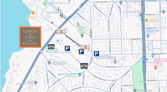 Larchmont Avenue on the north side of the Edison Ford museum (between McGregor Boulevard and Marlyn Road) will be closed for demolition and reconstruction for the foreseeable future. Please enter through the main entrance on McGregor Boulevard, or the rear entrance at Marlyn Road and Monte Vista Street. Parking is available in the Edison Ford lots, and at Edison Park Elementary School.